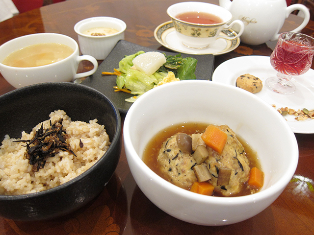 玄米ランチは、メイン料理、玄米ごはん、スープ、サラダ、たまご豆腐、ミニデザート、ポット紅茶がつきます。