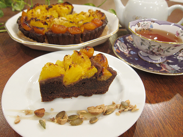 伊予柑のジューシーな甘酸っぱさと、金柑の爽やかな甘さ、ビターチョコレートのほろ苦さが、大人向けのタルトです。