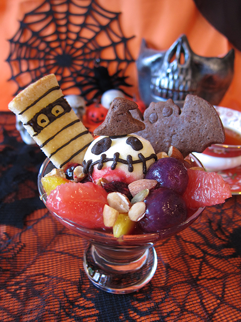 ドクロのアイス、ミイラのラスク、コウモリクッキーなどのおばけが集合したかわいいパフェです。