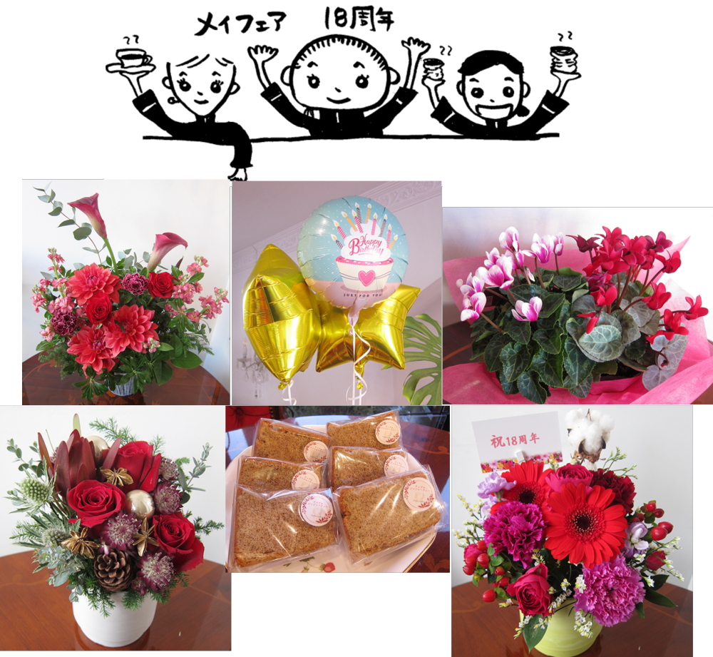 みなさまから、素敵なお花やシフォンケーキ、お祝いのお言葉をたくさんいただきました。